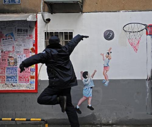在丰泉古井社区一条街巷里,一名路过的男子对着墙壁上漫画中的篮筐“投篮”(1月14日摄)。