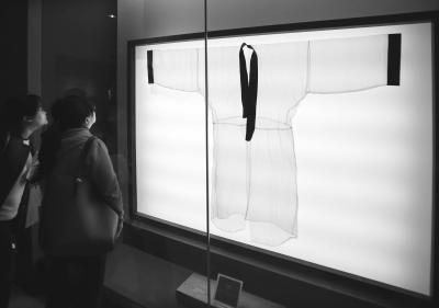 由于新展厅具备了“冷光源、防虫、防蛀”的展陈条件,一些从未拿出过库房的珍品也得以和观众见面。首批亮相的展品中,最吸引人注意的是国宝级文物复制品素纱襌衣。