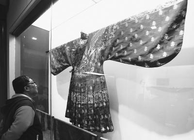 现场展示的各式各样龙袍也格外引人注目。明织金寿字龙云肩通袖龙襴妆花缎衬褶袍复制品,是根据明万历皇帝出去狩猎时所穿龙袍复制,袖口宽大可以用来放东西,下半身是百褶裙样式方便骑马。这件衣服上还绣有1000多个“寿”字!
