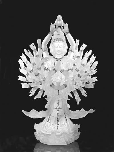 这座2米高的琉璃千手千眼观音像是台湾琉璃艺术家杨惠姗根据敦煌莫高窟元代壁画创作的,其工期历时4年,动员了100多位工艺师,用去4吨耐火石膏材和4吨琉璃晶质料,特制了5米高大窑炉,耗资超过2000万元。这是世界琉璃艺术史上,现存最大、最细致的佛像艺术作品。