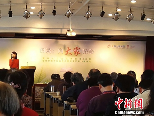 中新网北京4月23日电(上官云) 23日,在一年一度“世界图书和版权日”来临之际,以“阅读:向大家致敬”为主题的大众文化讲坛在北京举行。包括知名诗人西川到场,以主题演讲、经典作品片段朗诵等形式表达对阅读的钟情。