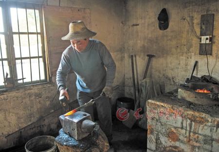 邱师傅说,打铁这手艺发不了财,如今杀茅砍柴的人几乎没有了,种田的人也越来越少,年轻人时兴打工,不愿意学打铁这一苦差事。前几天有人问他能不能打把菜刀,邱师傅拒绝了。打菜刀至少需要两个人,除非一下子能接几十把菜刀的生意,还可以临时请个人来,不然也做不来。