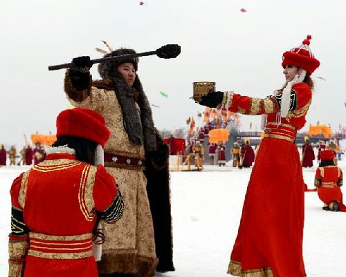 当日,为期7天的第三届辽宁康平卧龙湖大辽文化冬捕节在沈阳市康平县卧龙湖开幕,期间举行辽代祭祖仪式、祭湖醒网仪式、品尝鱼头汤、看雪雕等丰富多彩的系 列活动。卧龙湖位于沈阳北部,面积127.5平方公里,是辽宁省最大的平原淡水湖。当地的大辽文化冬捕节已经连续举办两届,辽代元素贯穿整个冬捕活动,成 为辽宁北部地区独具特色的冬季旅游品牌。新华网图片 燕东亮 摄